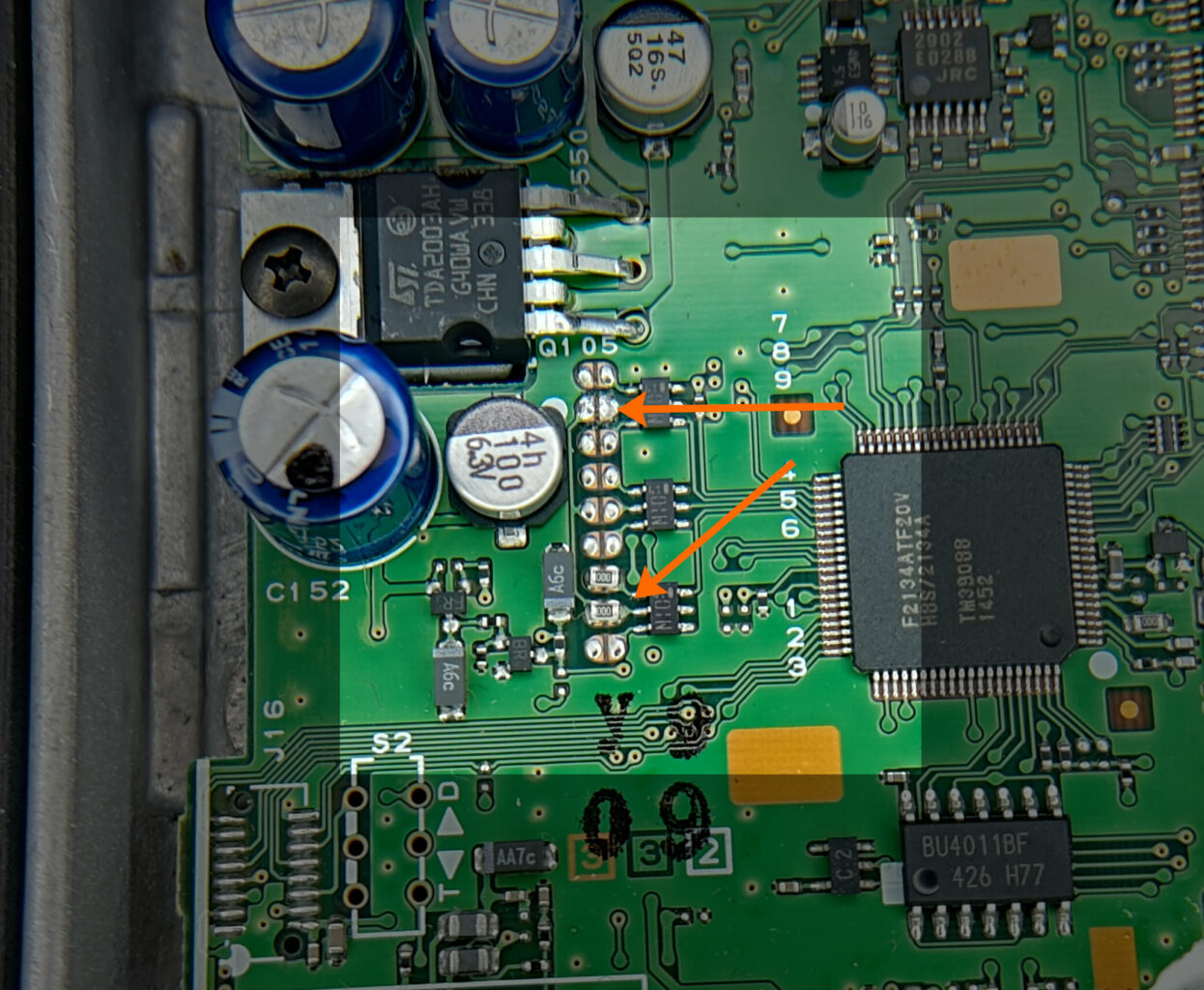 Na powyższym zdjęciu widać zworki (rezystory „0”) odpowiadające za konfigurację radia na dany region. W moim egzemplarzu, na rynek europejski, zworki znajdywały się na pozycjach – według numeracji widocznej obok – 8, 1 i 2. Daje to standardowe limity pasm w regionie 1.